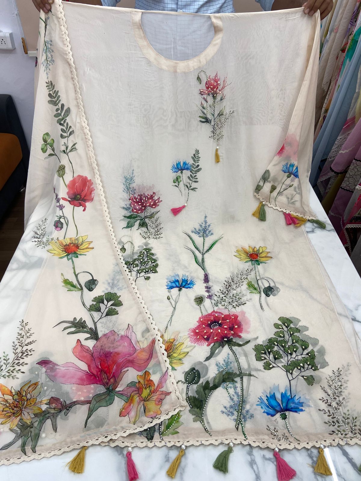 Step into a garden of elegance with this dreamy hand-painted style unstitched kurti set, crafted on a soft pastel beige fabric. Bursting with vibrant floral motifs in red, pink, blue, yellow, and green, each bloom is delicately accentuated with subtle embellishments and pearl-like detailing for added charm. The hemline and sleeve ends are finished with colorful tassels, adding a playful yet graceful touch to the overall look.