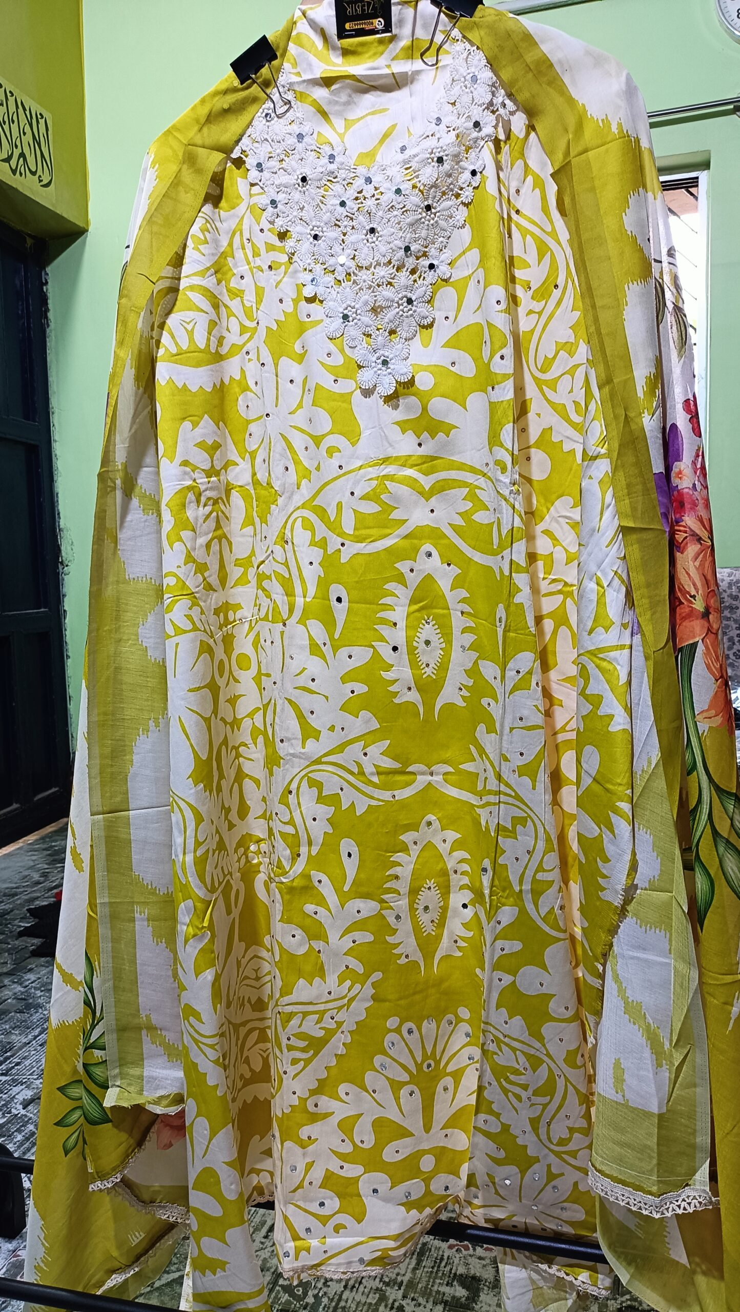 • Kameez Print: Features a large, intricate, all-over white print (resembling a stylized floral or paisley pattern) beautifully contrasting the bright yellow base.